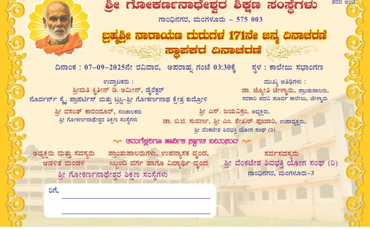 ಮಂಗಳೂರು: ಸಂತ ಸುಧಾರಕ ಬ್ರಹ್ಮಶ್ರೀ ನಾರಾಯಣ ಗುರುಸ್ವಾಮಿಯವರ ೧೭೧ ನೇ ಜನ್ಮ ದಿನಾಚರಣೆಯನ್ನು ತಾ.೦೭-೦೯-೨೦೨೫ ರಂದು ಶ್ರೀ ವೆಂಕಟೇಶ ಶಿವಭಕ್ತಿ ಯೋಗ ಸಂಘದ ಆಶ್ರಯದಲ್ಲಿ, ಗಾಂಧಿನಗರದ ಶ್ರೀ ಗೋಕರ್ಣನಾಥೇಶ್ವರ ಕಾಲೇಜಿನಲ್ಲಿ ಆಚರಿಸಲಾಗುವುದು.