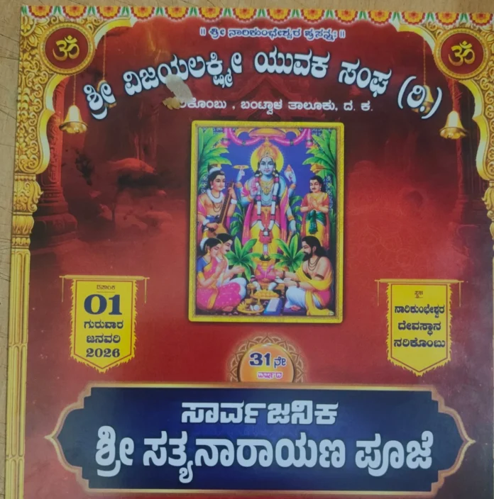 ಬಂಟ್ವಾಳ : ಬಂಟ್ವಾಳ ತಾಲೂಕು ನರಿಕೊಂಬು ಗ್ರಾಮದ ಶ್ರೀ ವಿಜಯಲಕ್ಷ್ಮಿ ಯುವಕ ಸಂಘ (ರಿ.) ಇದರ 31ನೇ ವರ್ಷದ ಸಾರ್ವಜನಿಕ ಶ್ರೀ ಸತ್ಯನಾರಾಯಣ ಪೂಜೆ ಹಾಗೂ ಸಾರ್ವಜನಿಕ ಅನ್ನ ಸಂತರ್ಪಣೆ ಕಾರ್ಯಕ್ರಮ ಜನವರಿ 1 .2026 ನೇ ಗುರುವಾರ ಬೆಳಿಗ್ಗೆ ಗಂಟೆ 9:00 ರಿಂದ ನರಿಕೊಂಬು ಶ್ರೀ ನಾರಿಕುಂಬೇಶ್ವರ ದೇವಸ್ಥಾನದಲ್ಲಿ ಜರಗಳಿದ್ದು ಭಕ್ತಾದಿಗಳು ಭಾಗವಹಿಸಿ ಶ್ರೀ ಸತ್ಯನಾರಾಯಣ ದೇವರ ಪ್ರಸಾದ ಸ್ವೀಕರಿಸಿ ದೇವರ ಕೃಪೆಗೆ ಪಾತ್ರರಾಗಬೇಕಾಗಿ ಸಂಘಟಕರು ಪ್ರಕಟಣೆಯಲ್ಲಿ ತಿಳಿಸಿರುತ್ತಾರೆ.
