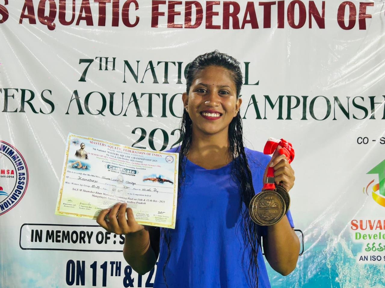 “ನ್ಯಾಷನಲ್ ಮಾಸ್ಟರ್ ಅಕ್ವಾಟಿಕ್ ಚಾಂಪಿಯನ್ಶಿಪ್ 2025” ಮಂಗಳಗಿರಿ, ಗುಂಟೂರು ಜಿಲ್ಲೆ, ಆಂಧ್ರಪ್ರದೇಶ ಇಲ್ಲಿ ದಿನಾಂಕ 11/ 10/ 2025 ರಂದು ನಡೆದ ರಾಷ್ಟ್ರಮಟ್ಟದ ಈಜು ಸ್ಪರ್ಧೆಯಲ್ಲಿ ವಿಟ್ಲದ ಹೆಮ್ಮೆಯ ಪ್ರತಿಭೆ ಶ್ರೀಲಕ್ಷ್ಮಿ ವಿಟ್ಲ ರವರು ಶ್ಲಾಘನೀಯ ಪ್ರದರ್ಶನವನ್ನು ನೀಡುವುದರೊಂದಿಗೆ ತಾವು ಭಾಗವಹಿಸಿದ ಐದು ಸ್ಪರ್ಧೆಗಳಾದ 200ಮೀ. ಫ್ರೀ ಸ್ಟೈಲ್ , 100ಮೀ. ರಿಲೇ(ವೈಯಕ್ತಿಕ) 50ಮೀ.ಬಟರ್ ಫ್ಲೈ,