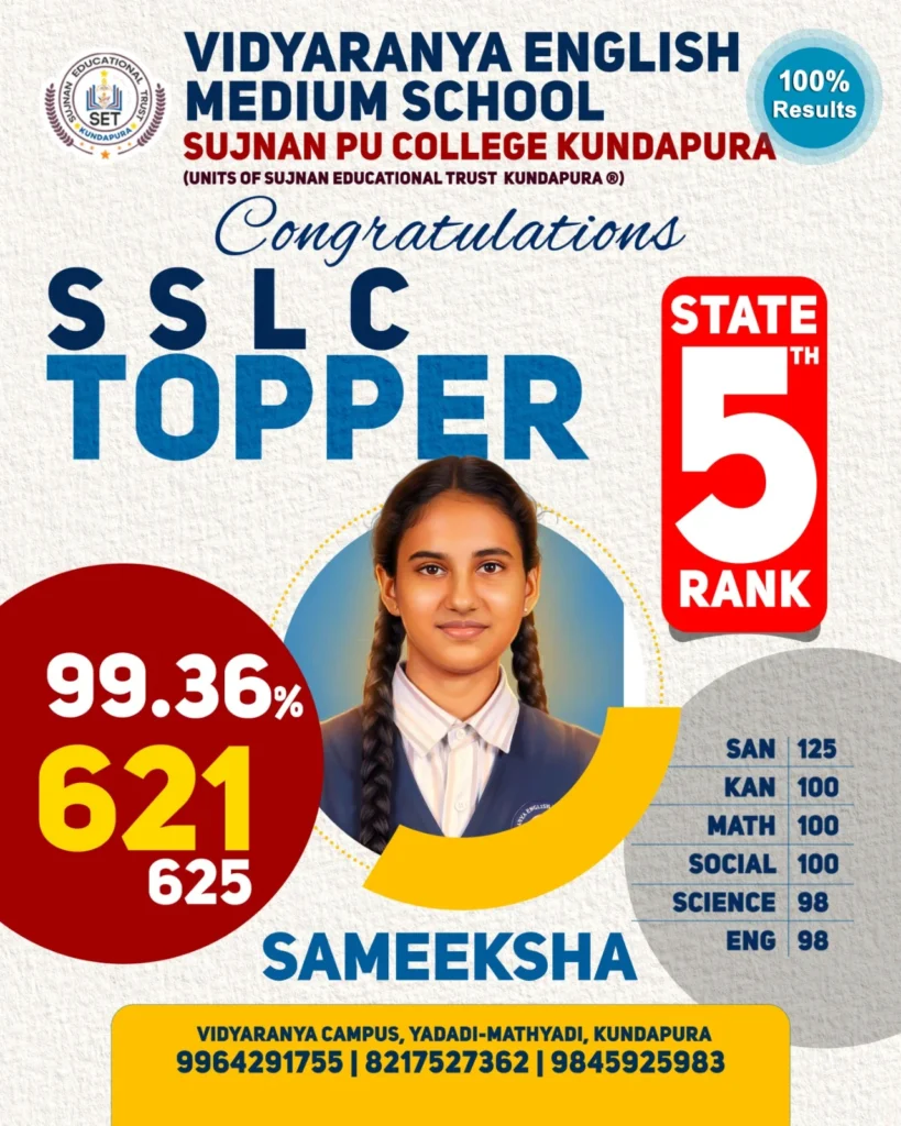 ಕುಂದಾಪುರ: ಕರ್ನಾಟಕ ಶಾಲಾ ಪರೀಕ್ಷೆ ಮತ್ತು ಮೌಲ್ಯನಿರ್ಣಯ ಮಂಡಳಿಯು ಪ್ರಕಟಿಸಿದ 2025-26ನೇ ಸಾಲಿನ ಎಸ್.ಎಸ್.ಎಲ್.ಸಿ. ಪರೀಕ್ಷಾ ಫಲಿತಾಂಶದಲ್ಲಿ, ಇಲ್ಲಿನ ಯಡಾಡಿ-ಮತ್ಯಾಡಿಯ ಸುಜ್ಞಾನ ಎಜುಕೇಶನಲ್ ಟ್ರಸ್ಟ್ನ ವಿದ್ಯಾರಣ್ಯ ಆಂಗ್ಲ ಮಾಧ್ಯಮ ಶಾಲೆಯ ವಿದ್ಯಾರ್ಥಿನಿ ಸಮೀಕ್ಷಾ ರಾಜ್ಯಮಟ್ಟದಲ್ಲಿ 5ನೇ ರ್ಯಾಂಕ್ ಪಡೆಯುವ ಮೂಲಕ ಅಭೂತಪೂರ್ವ ಸಾಧನೆ ಮಾಡಿದ್ದಾಳೆ.