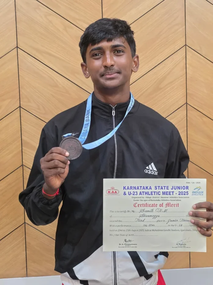 ಉಡುಪಿ : ಜಿಲ್ಲೆ ಅಮೆಚೂರ್ ಅಥ್ಲೆಟಿಕ್ ಅಸೋಸಿಯೇಷನ್ ಉಡುಪಿ ಇವರು ಅಜ್ಜರಕಾಡಿನ ಮಹಾತ್ಮಗಾಂಧಿ ಜಿಲ್ಲಾ ಕ್ರೀಡಾಂಗಣದಲ್ಲಿ ಆಯೋಜಿಸಿದ್ದ ರಾಜ್ಯಮಟ್ಟದ ಜೂನಿಯರ್ ಮತ್ತು ಸೀನಿಯರ್-23 ಅಥ್ಲೆಟಿಕ್ ಮೀಟ್-2025ರಲ್ಲಿ ಸುಜ್ಞಾನ ಪದವಿಪೂರ್ವ ಕಾಲೇಜಿನ ಸಮಿತ್ ಜಾವೆಲಿನ್ ಎಸೆತದಲ್ಲಿ ಮೂರನೇ ಸ್ಥಾನ ಗಳಿಸಿದ್ದಾರೆ.