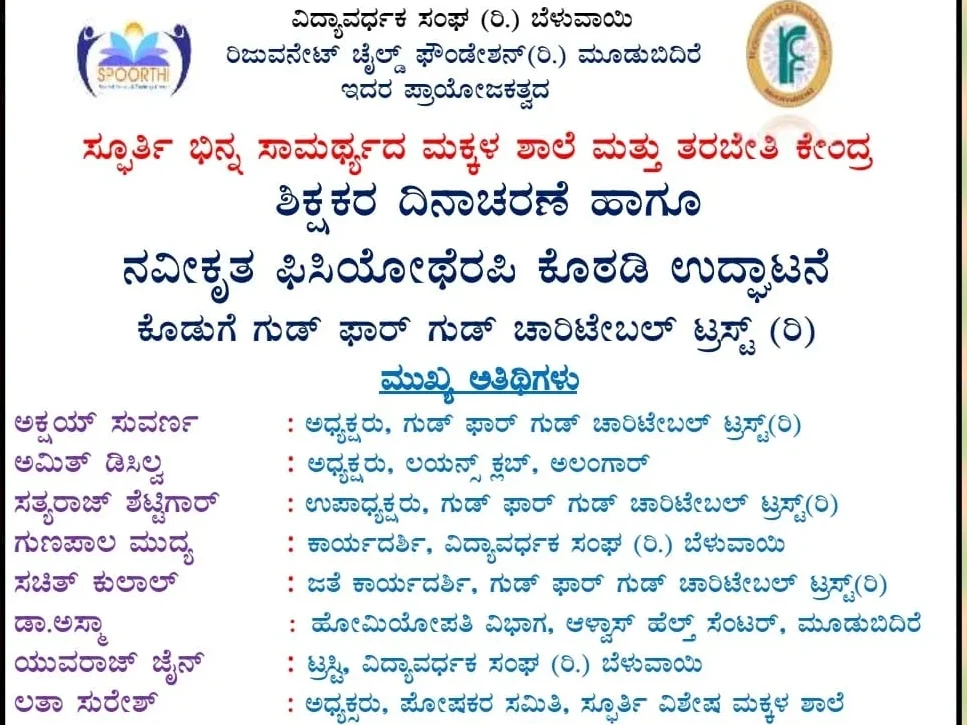 ಮೂಡುಬಿದಿರೆ: ಬೆಳುವಾಯಿ ಸ್ಫೂರ್ತಿ ಭಿನ್ನ ಸಾಮಾರ್ಥ್ಯದ ಮಕ್ಕಳ ಶಾಲೆ ಮತ್ತು ತರಬೇತಿ ಕೇಂದ್ರದಲ್ಲಿ ಶಿಕ್ಷಕರ ದಿನಾಚರಣೆ ಹಾಗೂ ಗುಡ್ ಫಾರ್ ಗುಡ್ ಚಾರಿಟೇಬಲ್ ಟ್ರಸ್ಟ್ ಕೊಡುಗೆಯ ನವೀಕೃತ ಪಿಸಿಯೋಥೆರಪಿ ಕೊಠಡಿ ಉದ್ಘಾಟನೆಯು ಸೆ. 12ರಂದು ಬೆಳಿಗ್ಗೆ 9-30ರಿಂದ ನಡೆಯಲಿದೆ.