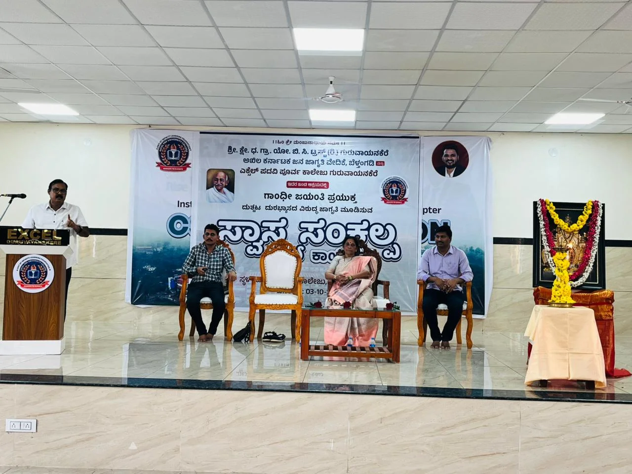 ಗುರುವಾಯನಕೆರೆ ::ಶ್ರೀ ಕ್ಷೇತ್ರ ಧರ್ಮಸ್ಥಳ ಗ್ರಾಮಾಭಿವೃದ್ಧಿ ಯೋಜನೆ ಬಿ. ಸಿ ಟ್ರಸ್ಟ್( R) ಗುರುವಾಯನಕೆರೆ, ಅಖಿಲ ಕರ್ನಾಟಕ ಜನ ಜಾಗೃತಿ ವೇದಿಕೆ ಬೆಳ್ತಂಗಡಿ ಮತ್ತು ಎಕ್ಸೆಲ್ ಪದವಿ ಪೂರ್ವ ಕಾಲೇಜು ಗುರುವಾಯನಕೆರೆ ಇದರ ಜಂಟಿ ಆಶ್ರಯದಲ್ಲಿ ಗಾಂಧಿ ಜಯಂತಿ ಪ್ರಯುಕ್ತ ದುಶ್ಚಟ ಗಳ ವಿರುದ್ಧ ಜಾಗೃತಿ ಮೂಡಿಸುವ ಸ್ವಾಸ್ತ್ಯ ಸಂಕಲ್ಪ ಕಾರ್ಯಕ್ರಮ ಎಕ್ಸೆಲ್ ಪದವಿ ಪೂರ್ವ ಕಾಲೇಜಿನಲ್ಲಿ ನಡೆಸಲಾಯಿತು.