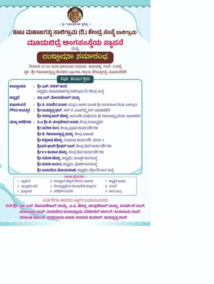ಮೂಡುಬಿದಿರೆ : ಬ್ರಾಹ್ಮಣ ಸಮಾಜದ ಪ್ರಬಲ ಶಕ್ತಿ ಹಾಗೂ ಸಾಂಸ್ಕೃತಿಕ ಪರಂಪರೆಯ ಪ್ರತೀಕವಾದ ಕೂಟ ಮಹಾಜಗತ್ತು ಸಾಲಿಗ್ರಾಮ (ರಿ.) ಸಂಸ್ಥೆಯು ತನ್ನ ವ್ಯಾಪ್ತಿಯನ್ನು ಮತ್ತಷ್ಟು ವಿಸ್ತರಿಸುತ್ತಿದೆ. ಕೂಟ ಬ್ರಾಹ್ಮಣರ ಐಕ್ಯತೆ ಮತ್ತು ಅಭ್ಯುದಯದ ದ್ಯೋತಕವಾಗಿ, ಮೂಡುಬಿದಿರೆಯಲ್ಲಿ ಸಂಸ್ಥೆಯ 38ನೇ ಅಂಗಸಂಸ್ಥೆಯು ಅತ್ಯಂತ ವೈಭವದಿಂದ ಲೋಕಾರ್ಪಣೆಗೊಳ್ಳಲು ಸಜ್ಜಾಗಿದೆ.