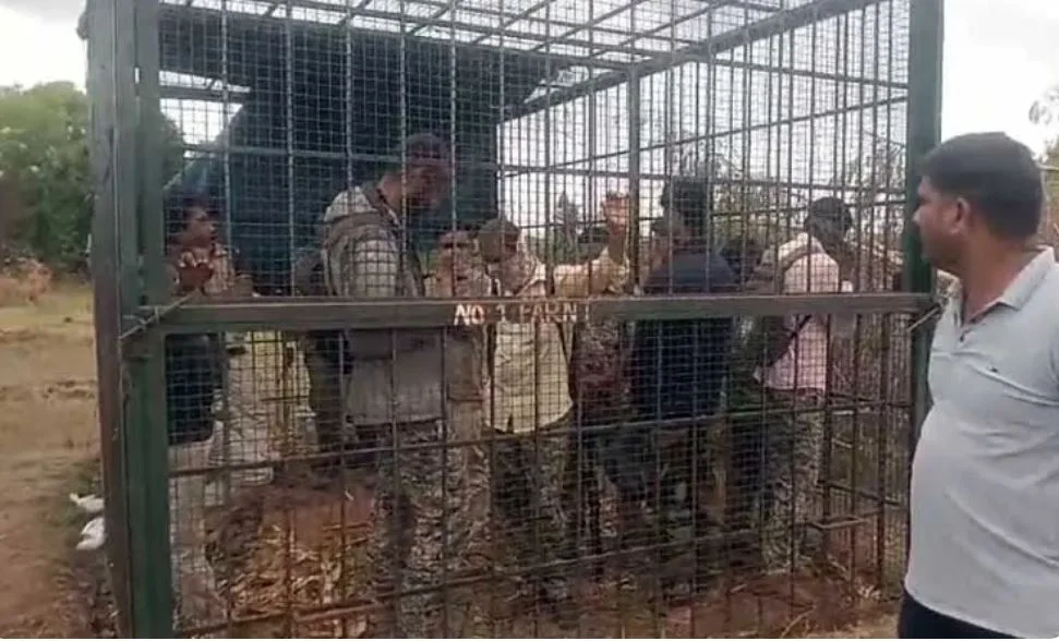 ಗುಂಡ್ಲುಪೇಟೆ(ಚಾಮರಾಜನಗರ): ಹುಲಿ ಸೆರೆ ಹಿಡಿಯಲು ಅರಣ್ಯ ಇಲಾಖೆ ವಿಫಲವಾದ ಹಿನ್ನೆಲೆ ಸುಮಾರು 10ಕ್ಕೂ ಅಧಿಕ ಮಂದಿ ರೈತರು ಅಣ್ಯಾಧಿಕಾರಿಗಳು ಹಾಗೂ ಸಿಬ್ಬಂದಿಗಳನ್ನು ಬೋನಿನಲ್ಲಿ ಕೂಡಿ ಹಾಕಿ, ದಿಗ್ಭಂಧನ ವಿಧಿಸಿದ ಅಪರೂಪದ ಪ್ರಸಂಗ ಬಫರ್ ಜೋನ್ ವಲಯ ವ್ಯಾಪ್ತಿಯ ತಾಲೂಕಿನ ಬೊಮ್ಮಲಾಪುರ ಗ್ರಾಮದಲ್ಲಿ ಮಂಗಳವಾರ (ಸೆ.9) ಬೆಳಿಗ್ಗೆ ನಡೆದಿದೆ.