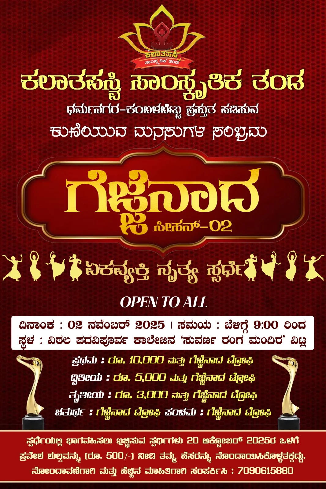 ಕುಣಿಯುವ ಮನಸ್ಸುಗಳಿಗೆ ವೇದಿಕೆಯನ್ನು ಕಲ್ಪಿಸಿಕೊಡುವ ಉದ್ದೇಶದಿಂದ ಕಳೆದ ಜನವರಿ ತಿಂಗಳಲ್ಲಿ ಗೆಜ್ಜೆನಾದ-2025 ಎನ್ನುವ ಹೆಸರಿನಲ್ಲಿ ನೃತ್ಯ ಸ್ಪರ್ಧೆಯನ್ನು ಆಯೋಜಿಸಿ, ಯಶಸ್ವಿಯಾಗಿ ಸ್ಪರ್ಧೆಯನ್ನು ನಡೆಸಿ ಕಲಾಭಿಮಾನಿಗಳ ಮನವನ್ನು ತಂಡ ಗೆದ್ದಿತ್ತು. ಈಗ ಅದೇ ಯಶಸ್ಸಿನ ಮುಂದುವರಿದ ಭಾಗವಾಗಿ ನವೆಂಬರ್ 02ನೇ ಆದಿತ್ಯವಾರ.. ವಿಠಲ ಪದವಿಪೂರ್ವ ಕಾಲೇಜಿನ ಸುವರ್ಣ ರಂಗಮಂದಿರದಲ್ಲಿ ಗೆಜ್ಜೆನಾದ-ಸೀಸನ್ 2 ಸ್ಪರ್ಧೆ ನಡೆಯಲಿದೆ.