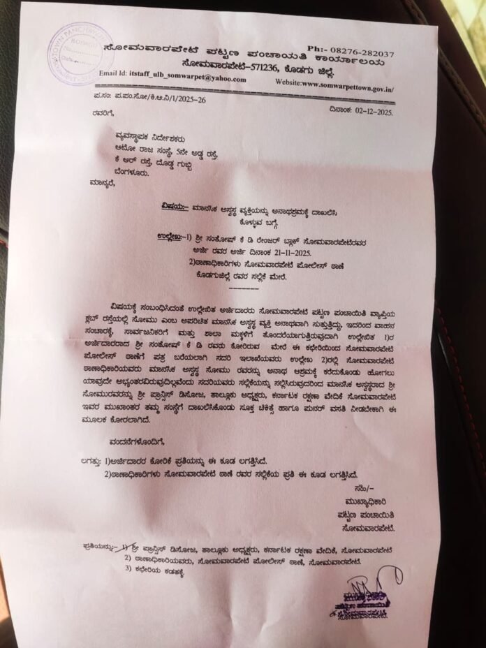 ಸೋಮವಾರಪೇಟೆ ಸಂತೆಮಳದಲ್ಲಿ ಕಳೆದ ಒಂದು ವಾರದಿಂದ ಅನಾರೋಗ್ಯ ಸರಿಯಿಲ್ಲದೆ ಮಲಗಿಕೊಂಡಿದ್ದ ಸೋಮು ವ್ಯಕ್ತಿಯನ್ನು ಸೋಮವಾರಪೇಟೆ ತಾಲೂಕಿನ ವರ್ತಕರಾದ ಸಂತೋಷ ರವರು ಇವರನ್ನು ಗಮನಿಸಿ ಕರವೇ ಫೋನ್ ಮಾಡಿ ಇವರ ಬಗ್ಗೆ ತಿಳಿಸಿರುತ್ತಾರೆ . ಆಗ ನಾವು ಟೌನ್ ಪಂಚಾಯತಿಗೆ ತಾವು ಒಂದು ಮನವಿ ಕೊಡಿ ತಿಳಿಸದ ಮೇರೆಗೆ ಟೌನ್ ಪಂಚಾಯತಿಗೆ ಮನವಿ ಕೊಟ್ಟಿರುತ್ತಾರೆ . ಮನವಿ ಮೇರೆಗೆ ಕರವೇ ಅಧ್ಯಕ್ಷರು ಸಂಪರ್ಕಿಸಿದರು ತದನಂತರ ಕರವೇಯಿಂದ ಪೊಲೀಸ್ ಪರ್ಮಿಷನ್ ಪಡೆದು ಟೌನ್ ಪಂಚಾಯತಿ ಸಹಕಾರದೊಂದಿಗೆ ಸ್ನಾನ ಮಾಡಿಸಿ ಇವರನ್ನು ಬಿಟ್ಟು ಬಂದಿರುತ್ತೇವೆ,ಯಾಕೆಂದರೆ ಒಂದು ಮಾನವೀಯ ದೃಷ್ಟಿಯಿಂದ ಯಾರು ಒಂದು ಸೋರಿಲ್ಲದೆ ಮಲಗಬಾರದೆಂದು ಕರವೇ ಆಶ್ರಯ ಹಾಗಾಗಿ ಪ್ರತಿದಿನವೂ ಇತರ ಕೆಲಸ ಮಾಡಿಕೊಂಡೆ ಬರುತ್ತಿದ್ದೇವೆ ಮುಂದೆ ಇದೇ ತರ ಕೆಲಸ ಮಾಡಿಕೊಂಡು ಬಡವರ ಪರ ಕೆಲಸ ಮಾಡಿಕೊಡಲು ಸಿದ್ಧರಿರುತ್ತೇವೆ , ಈ ಸಮಯದಲ್ಲಿ ನಮಗೆ ಸಹಕರಿಸಿದ ಟೌನ್ ಪಂಚಾಯತಿಯವರಿಗೂ ಹಾಗೂ ಟೌನ್ ಪಂಚಾಯತಿಯಿಂದ ವಾಹನದ ವ್ಯವಸ್ಥೆ ಮಾಡಿಕೊಡಲಾಗಿತ್ತು . ಇದೇ ಸಮಯದಲ್ಲಿ ನಮಗೆ ಸಹಕರಿಸಿದ ಪ್ರತಿಯೊಬ್ಬರಿಗೂ ಹೃದಯಪೂರ್ವಕ ಧನ್ಯವಾದಗಳು ಮತ್ತು ಪೌರಕಾರ್ಮಿಕರಿಗೂ ಹೃದಯಪೂರ್ವಕ ಧನ್ಯವಾದಗಳು ಅರ್ಪಿಸುತ್ತೇನೆ ಅದೇ ಸಮಯದಲ್ಲಿ ಸ್ಥಾನ ಮಾಡಿಸಲು ನೀರು ಕೊಟ್ಟಂತ ಎಲ್ಲರಿಗೂ ಮತ್ತು ಪರೋಕ್ಷವಾಗಿ ಸಹಕರಿಸಿದ ಎಲ್ಲರಿಗೂ ಹೃದಯಪೂರ್ವಕ ಧನ್ಯವಾದಗಳು ಅರ್ಪಿಸುತ್ತೇನೆ .