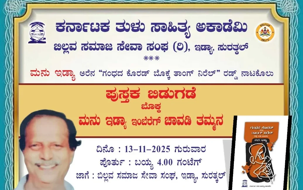 ಮಂಗಳೂರು: ಕರ್ನಾಟಕ ತುಳು ಸಾಹಿತ್ಯ ಅಕಾಡೆಮಿ ಪ್ರಕಟಿತ ಹಿರಿಯ ನಾಟಕಕಾರ ಮನು ಇಡ್ಯಾ ಅವರು ಬರೆದ ‘ಗಂಧದ ಕೊರಡ್ ಬೊಕ್ಕ ತಾಂಗ್ ನಿರೆಲ್’ ಎರಡು ನಾಟಕಗಳ ಪುಸ್ತಕ ಬಿಡುಗಡೆ ಮತ್ತು ಮನು ಇಡ್ಯಾ ಅವರಿಗೆ ಚಾವಡಿ ತಮ್ಮನ ಕಾರ್ಯಕ್ರಮ ನ.13 ರಂದು ಸಂಜೆ 4:00 ಗಂಟೆಗೆ ಬಿಲ್ಲವ ಸಮಾಜ ಸೇವಾ ಸಂಘ ಇಡ್ಯಾ ಸುರತ್ಕಲ್ ಇಲ್ಲಿ ನಡೆಯಲಿದೆ.