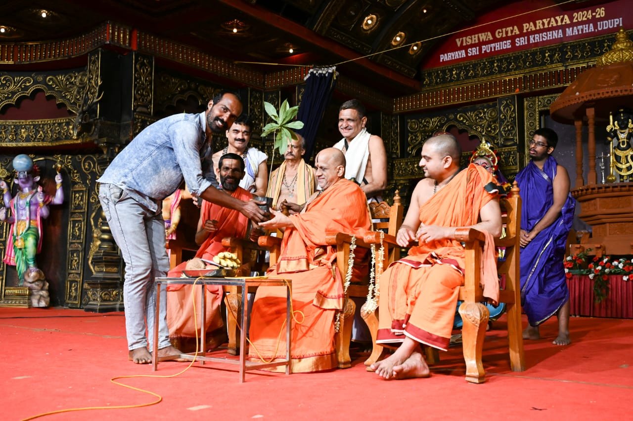 ಉಡುಪಿ : ಕೃಷ್ಣಮಠದಲ್ಲಿ ಪುತ್ತಿಗೆ ಶ್ರೀ ಕೃಷ್ಣ ಮಠದ ಆಶ್ರಯದಲ್ಲಿ ನವೆಂಬರ್ 8ರಿಂದ ಡಿ.7ರವರೆಗೆ ನಡೆಯುತ್ತಿರುವ ಬೃಹತ್ ಗೀತೋತ್ಸವ ಸಂತ ಸಂದೇಶ ಕಾರ್ಯಕ್ರಮದಲ್ಲಿ ನವೆಂಬರ್ 12ರಂದು ದೇಶದ ಅನೇಕ ಕಡೆಗಳಲ್ಲಿ ನಾಗಲಿಂಗ ಪುಷ್ಪವನ್ನು ಗಿಡವನ್ನು ನೆಟ್ಟ ಪರಸರ ಪ್ರೇಮಿ ವಿನೇಶ್ ಅವರಿಂದ ನಾಗಲಿಂಗ ಪುಷ್ಪದ ಗಿಡವೊಂದನ್ನು ಪುತ್ತಿಗೆj ಮಠದ ಸ್ವಾಮಿಗಳಾದ ಶ್ರೀ ಸುಗುಣೇಂದ್ರ ತೀರ್ಥ ಸ್ವಾಮೀಜಿ, ಹಾಗೂ ಅವರ ಶಿಷ್ಯ ಮತ್ತು ಶ್ರೀ ಈಶ ವಿಠಲದಾಸ ಸ್ವಾಮೀಜಿ ಅವರ ಸಮ್ಮುಖದಲ್ಲಿ ಹಸ್ತಾಂತರಿಸಿದರು.