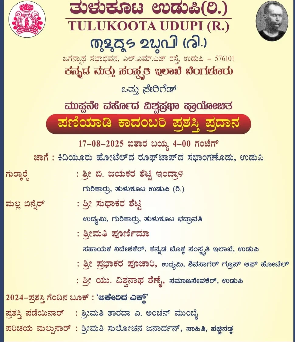 ಉಡುಪಿ: ತುಳುಕೂಟ ಉಡುಪಿ (ರಿ) ಮತ್ತು ಕನ್ನಡ ಮತ್ತು ಸಂಸ್ಕತಿ ಇಲಾಖೆ ಬೆಂಗಳೂರು ಇವರ ಸಹಯೋಗದಲ್ಲಿ 30ನೇ ವರ್ಷದ ವಿಶ್ವಪ್ರಭಾ ಪ್ರಾಯೋಜಿತ ಪಣಿಯಾಡಿ ಕಾದಂಬರಿ ಪ್ರಶಸ್ತಿ ಪ್ರದಾನ ಕಾರ್ಯಕ್ರಮವು ಆಗಸ್ಟ್ 17 |ಭಾನುವಾರ ಸಂಜೆ 4 ಗಂಟೆಗೆ ಕಿದಿಯೂರು ಹೋಟೆಲ್ನ ರೂಫ್ ಟಾಪ್ ಸಭಾಂಗಣ ಉಡುಪಿಯಲ್ಲಿ ಜರುಗಲಿದೆ.
