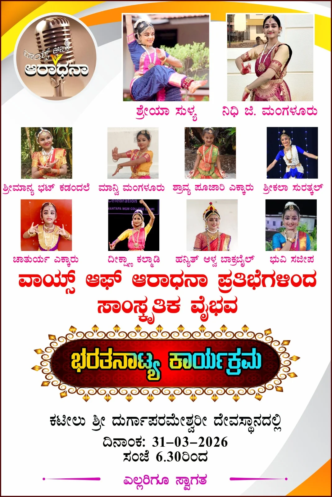 ಕಟೀಲು ಶ್ರೀ ದುರ್ಗಾಪರಮೇಶ್ವರೀ ದೇವಸ್ಥಾನದ ಪವಿತ್ರ ಸನ್ನಿಧಿಯಲ್ಲಿ ಈ ನೃತ್ಯ ವೈಭವ ನಡೆಯಲಿದೆ . ದಿನಾಂಕ: 31-03-2026 ಸಮಯ: ಸಂಜೆ 6:30 ರಿಂದ