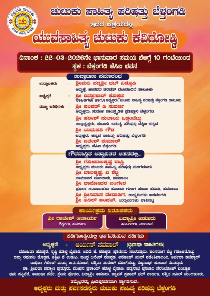 ಸಾಹಿತಿಗಳ ಗೌರವಾನ್ವಿತ ಅಧ್ಯಕ್ಷತೆಯಲ್ಲಿ ನಡೆಯುವ ಈ ಗೋಷ್ಠಿಯಲ್ಲಿ ಜಿಲ್ಲೆಯ ಮೂಲೆ ಮೂಲೆಗಳಿಂದ ಆಗಮಿಸುವ ಯುವ ಕವಿಗಳು ತಮ್ಮ ಕವನಗಳ ಮೂಲಕ ಸಾಮಾಜಿಕ, ಸಾಂಸ್ಕೃತಿಕ ಮತ್ತು ಪ್ರಚಲಿತ ವಿದ್ಯಮಾನಗಳ ಮೇಲೆ ಬೆಳಕು ಚೆಲ್ಲಲಿದ್ದಾರೆ. ಯುವ ಮನಸ್ಸುಗಳ ಸೃಜನಶೀಲತೆಗೆ ನೀರೆರೆಯುವ ಈ ಕಾರ್ಯಕ್ರಮವು ಸಾಹಿತ್ಯ ಲೋಕಕ್ಕೆ ಹೊಸ ಭರವಸೆಯನ್ನು ನೀಡಲಿದೆ.