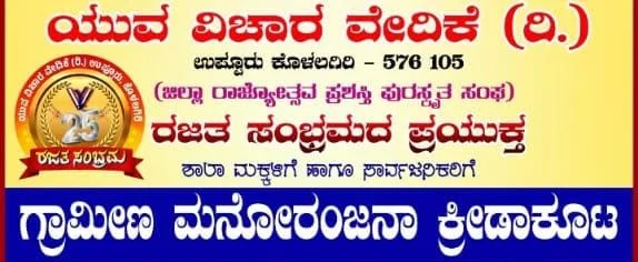 ಯುವ ವಿಚಾರ ವೇದಿಕೆ (ರಿ) ಉಪ್ಪೂರು ಕೊಳಲಗಿರಿ ಉಡುಪಿ( ಜಿಲ್ಲಾ ರಾಜ್ಯೋತ್ಸವ ಪ್ರಶಸ್ತಿ ಪುರಸ್ಕೃತ ಸಂಘ ) ರಜತ ಸಂಭ್ರಮದ ಪ್ರಯುಕ್ತ ಶಾಲಾ ಮಕ್ಕಳಿಗೆ ಹಾಗೂ ಸಾರ್ವಜನಿಕರಿಗೆ ಗ್ರಾಮೀಣ ಮನೋರಂಜನಾ ಕ್ರೀಡಾಕೂಟವು ದಿನಾಂಕ 11-01-2026 ಆದಿತ್ಯವಾರದಂದು ಸರ್ಕಾರಿ ಪ್ರೌಢಶಾಲೆ ಉಪ್ಪೂರು ಕೊಳಲಗಿರಿ ಉಡುಪಿ ಬೆಳಿಗ್ಗೆ 9:00 ರಿಂದ ಮಧ್ಯಾಹ್ನ 1 ಗಂಟೆಯವರೆಗೆ ಜರಗಲಿರುವುದು.