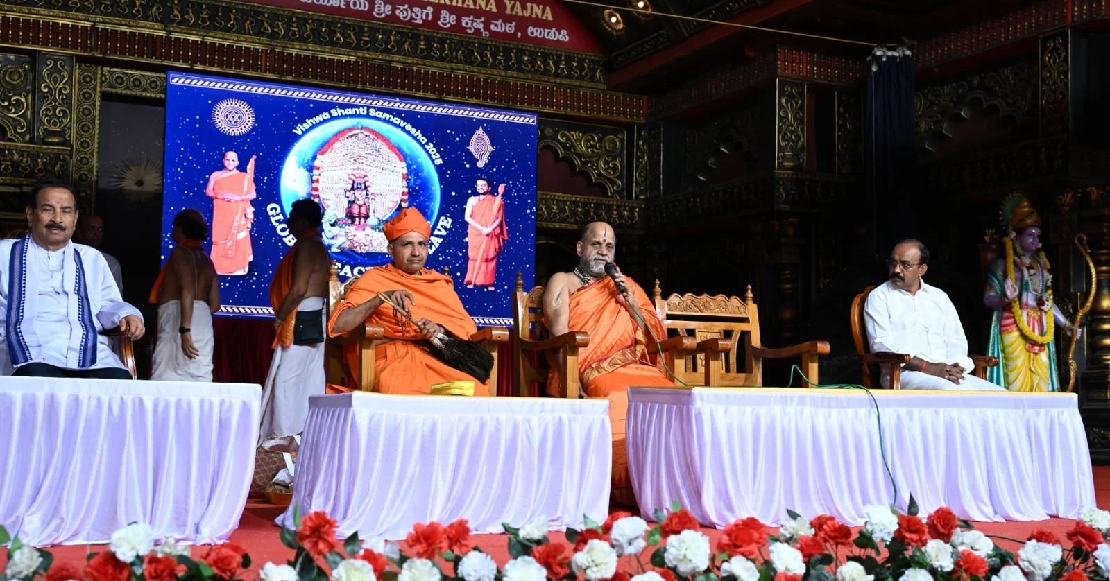 13-12-2025 ಪರ್ಯಾಯ ಶ್ರೀ ಪುತ್ತಿಗೆ ಮಠ ಶ್ರೀಕೃಷ್ಣ ಮಠ ,ಉಡುಪಿ ವಿಶ್ವಗೀತಾ ಪರ್ಯಾಯ 2024-2026 ಶ್ರೀ ಕೃಷ್ಣಮಠದ ರಾಜಾಂಗಣದಲ್ಲಿ ಪರ್ಯಾಯ ಪುತ್ತಿಗೆ ಶ್ರೀಕೃಷ್ಣ ಮಠ ಆಶ್ರಯದಲ್ಲಿ ವಿಶ್ವಗೀತಾ ಪರ್ಯಾಯ ಸಂದರ್ಭದಲ್ಲಿ ರಾಜಾಂಗಣದಲ್ಲಿ ಪರ್ಯಾಯ ಪುತ್ತಿಗೆ ಮಠಾಧೀಶ ಶ್ರೀ ಸುಗುಣೇಂದ್ರತೀರ್ಥ ಶ್ರೀಪಾದರು ಹಾಗೂ ಕಿರಿಯ ಶ್ರೀ ಸುಶ್ರೀಂದ್ರತೀರ್ಥ ಶ್ರೀಪಾದರ ಉಪಸ್ಥಿತಿಯಲ್ಲಿ ವಿಶ್ವಶಾಂತಿ ಸಮಾವೇಶದ ಸಮಾರೋಪ ಸಮಾರಂಭ ಈ ಕಾರ್ಯಕ್ರಮದಲ್ಲಿ ಮೂಡುಬಿದಿರೆ ಜೈನ ಮಠದ ಸ್ವಸ್ತಿಶ್ರೀ ಭಟ್ಟಾರಕ ಚಾರುಕೀರ್ತಿ ಪಂಡಿತಾಚಾರ್ಯವರ್ಯ ಸ್ವಾಮೀಜಿ , ವಿಧಾನ ಪರಿಷತ್ ಸದಸ್ಯ ಐವನ್ ಡಿ’ಸೋಜ , ವಾಗ್ಮಿ ಡಾ.ಕೆ.ಪಿ.ಪುತ್ತೂರಾಯ ಉಪಸ್ಥಿತರಿದ್ದರು .