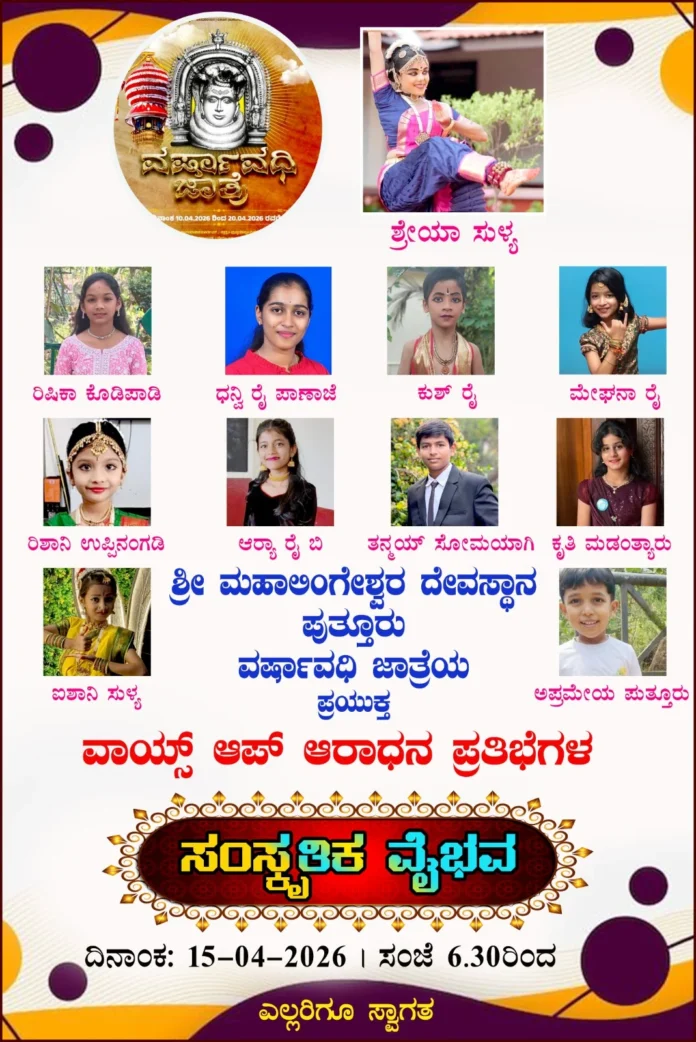 ಪುತ್ತೂರು : ಕರಾವಳಿಯ ಪ್ರಸಿದ್ಧ ಧಾರ್ಮಿಕ ಕ್ಷೇತ್ರವಾದ ಪುತ್ತೂರಿನ ಶ್ರೀ ಮಹಾಲಿಂಗೇಶ್ವರ ದೇವಸ್ಥಾನದ ವರ್ಷಾವಧಿ ಜಾತ್ರೋತ್ಸವದ ಸಂಭ್ರಮಕ್ಕೆ ಈ ಬಾರಿಯೂ ಕಲಾ ಮೆರುಗು ಸಿಗಲಿದೆ. ಕಳೆದ ಹಲವು ವರ್ಷಗಳಿಂದ ನಿರಂತರವಾಗಿ ದೇವಸ್ಥಾನದ ಸಾಂಸ್ಕೃತಿಕ ವೇದಿಕೆಯಲ್ಲಿ ತನ್ನ ವಿಶಿಷ್ಟ ಛಾಪು ಮೂಡಿಸುತ್ತಾ ಬಂದಿರುವ ‘ವಾಯ್ಸ್ ಆಫ್ ಆರಾಧನಾ’ ತಂಡವು ಈ ವರ್ಷವೂ ಅದ್ದೂರಿ “ಸಾಂ ಸ್ಕೃತಿಕ ವೈಭವ” ಕಾರ್ಯಕ್ರಮವನ್ನು ಪ್ರಸ್ತುತಪಡಿಸಲಿದೆ.