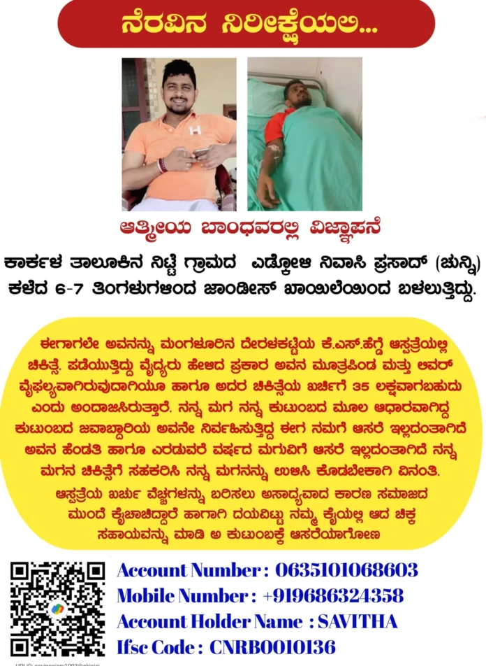 ಕಾರ್ಕಳ: ತಾಲೂಕಿನ ನಿಟ್ಟೆ ಗ್ರಾಮದ ಎಡೋಳಿ ನಿವಾಸಿ ಪ್ರಸಾದ್ (ಚುನ್ನಿ) ಕಳೆದ ಆರೇಲು ತಿಂಗಳುಗಳಿಂದ ಜಾಂಡೀಸ್ ಖಾಯಿಲೆಯಿಂದ ಬಳಲುತ್ತಿದ್ದು, ಮಂಗಳೂರಿನ ದೇರಳಕಟ್ಟೆಯ ಕೆ.ಎಸ್.ಹೆಗ್ಡೆ ಆಸ್ಪತ್ರೆಯಲ್ಲಿ ಒಳರೋಗಿಯಾಗಿ ಚಿಕಿತ್ಸೆ ಪಡೆಯುತ್ತಿದ್ದಾರೆ.