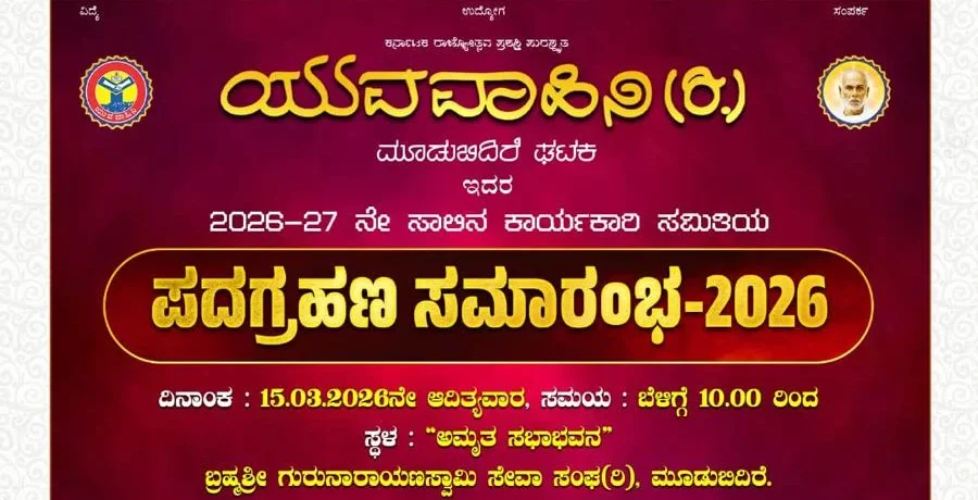 ಮಾ.15ರಂದು ಬೆಳ್ಳಿಗ್ಗೆ 10-00 ರಿಂದ “ಅಮೃತ ಸಭಾಭನ” ಬ್ರಹ್ಮಶ್ರೀ ಗುರುನಾರಾಯಣಸ್ವಾಮಿ ಸೇವಾ ಸಂಘ(ರಿ), ಮೂಡುಬಿದಿರೆ ಇಲ್ಲಿ , ಯುವವಾಹಿನಿ (ರಿ.) ಮೂಡುಬಿದಿರೆ ಘಟಕ ಇದರ 2026-27 ನೇ ಸಾಲಿನ ಕಾರ್ಯಕಾರಿ ಸಮಿತಿಯ ಪದಗ್ರಹಣ ಸಮಾರಂಭ-2026 ನಡೆಯಲಿದೆ.